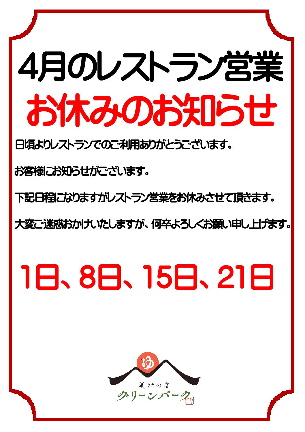 3. 4月のレストランの休業日について